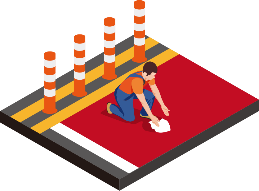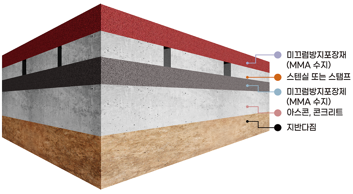 미끄럼방지포장제는 MMA(Methyl Meth Acrylate) RESIN을 주성분으로 한 2액형 MMA계 수지로 제작되었습니다.