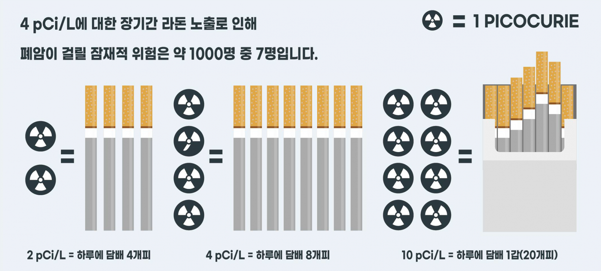 완화가 권장 됩니다. 4.0pCi/L의 라돈은 하루에 8개비의 담배를 피우는 것과 비슷합니다.