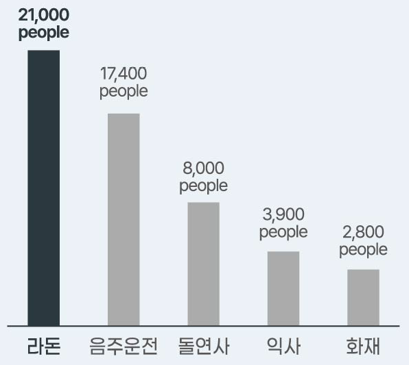 라돈으로 인한 연간 사망자 수: 21,000명